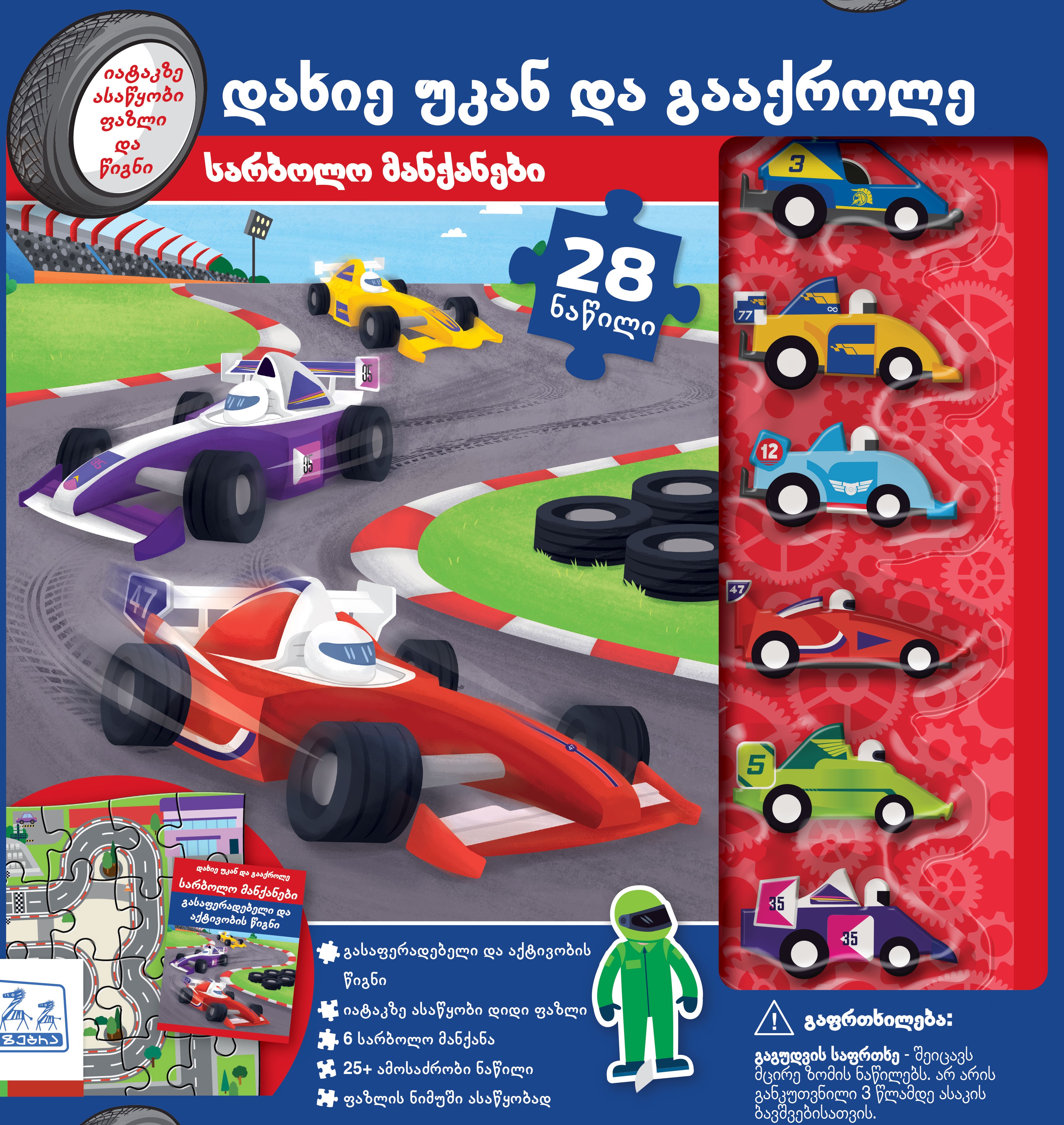 ამ სარბოლო მანქანებით შეგიძლიათ საათობით შეიქციოთ თავი! ააწყვეთ ავტოდრომი, დაამწკრივეთ მანქანები და გააქროლეთ! როდესაც ავტოდრომის დაფის მოწყობას დაასრულებთ, აიღეთ გასაფერადებელი და აქტივობის 32-გვერდიანი წიგნი, რომელიც სავსეა სარბოლო თემატიკის სახალისო დავალებებით. შეასრულეთ დავალებები და თან რბოლისა და მრბოლელების ამბავი წაიკითხეთ.